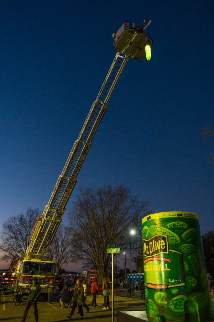 - Bring canned food or financial contribution for the Food Bank of Central & Eastern NC and receive a ticket for a door prize drawing. The grand prize is a pickle like the one that is dropped, without the lights.